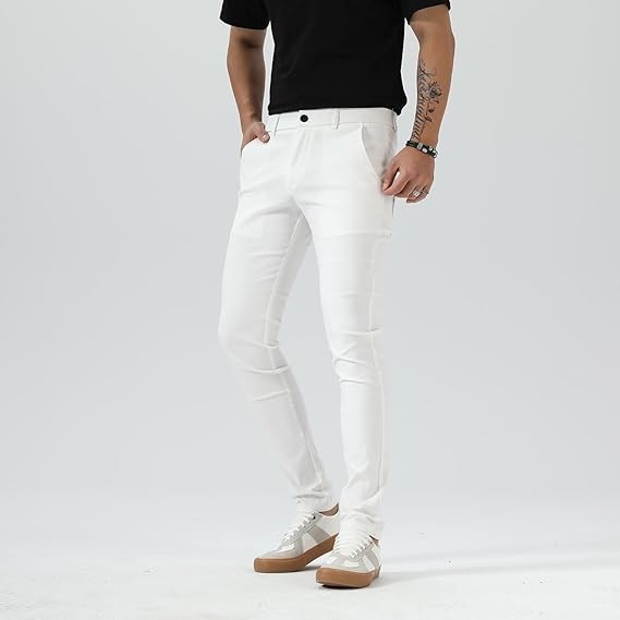 Skinny fit through hip and thigh, these plaid pants for men sit at the natural waist; the innovative mens plaid dress pants bring younger looking. ALL-DAY COMFORT. Made from a nylon &viscose blend with added spandex that moves with you for all day comfort. Throw together an effortless look with these skinny pants for men. With these mens skinny dress pants, we make looking great incredibly easy. Keep it casual and stylish as you step out wearing the mens skinny pants, these men's skinny dress pants can keep you comfort all day. Whether you step into the office or step out on the weekend, our men's skinny chinos fit your needs perfectly. Thank to the TR fabric with flex, even they are Skinny fit, you can still move and walk freely wearing these mens fashion pants. And these fashion pants for men bring a sleek silhouette. Pinstripe pants for who want a more modern feel with the refined extra slim fit, the style it's good for dress up and dress down.
