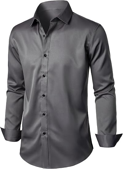 Care: Machine wash,tumble dry or line dry,low temperature ironing Slightly Shiny Fabric:Like satin silk, this shirt has more shiny than cotton dress shirts. It is soft and comfortable to the touch, cool and smooth, beautiful and eye-catching, making it very suitable for weddings, balls, parties, and other events. If used in work or business occasions, it might be too shiny Slight Elasticity:Due to the fabric containing only 5% spandex, the elasticity is relatively weak. The elasticity of this shirt runs horizontally from left to right. Polyester-spandex blended fabric offers excellent stability,low shrinkage rate, durable Slim Fit:Compared to classic slim fit shirts, this shirt has longer sleeves and a slightly wider waist. If you prefer an extremely fitted look, we recommend choosing a smaller size Wrinkle-Free:Due to packaging reasons, the shirt may need ironing before its first use; "wrinkle-free" means that the shirt has been treated to be less prone to wrinkles compared to regular clothing, making it easier to care for. However, this does not mean that it will never have wrinkles