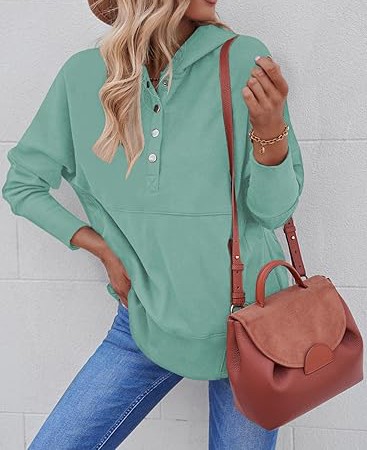 Material: 95% Polyester + 5% Elastane; This trendy cute hoodie top is made of soft and skin-friendly fabric, comfy and comfortable, providing you with a loose and cozy wearing experience. Features: This trendy hoodie sweatshirt for women features long sleeves, a button-down V-neck, a large kangaroo pocket, and an oversized design for a relaxed and baggy appearance. The cuffs, hem, and pocket edges are ribbed for ample elasticity, offering a superior wearing experience suitable for any body type. It's a great addition to your wardrobe. Match:Loose-fitting hoodie tops effortlessly complement various casual bottoms like leggings, pants, jeans, joggers, and shorts, when paired with sneakers or casual shoes, to achieve a stylish and chic appearance during the spring, fall, and winter seasons. Wearing it creates the most beautiful and stylish look. Occasion:This pullover sweatshirt is Perfect for daily, home, school, shopping, going out, club, night out, holiday, weekend, vacation, office, work, date, streetwear, etc.It's also a good gift to your friend or family in spring,fall and winter.
