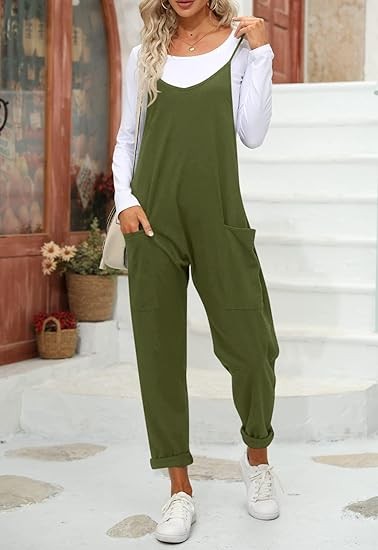 Features: Women sleeveless rompers, with relaxed fit design, solid color, two big side pockets, low crotch, back pocket decoration, long pants jumpsuits, cute and stylish outfits for women