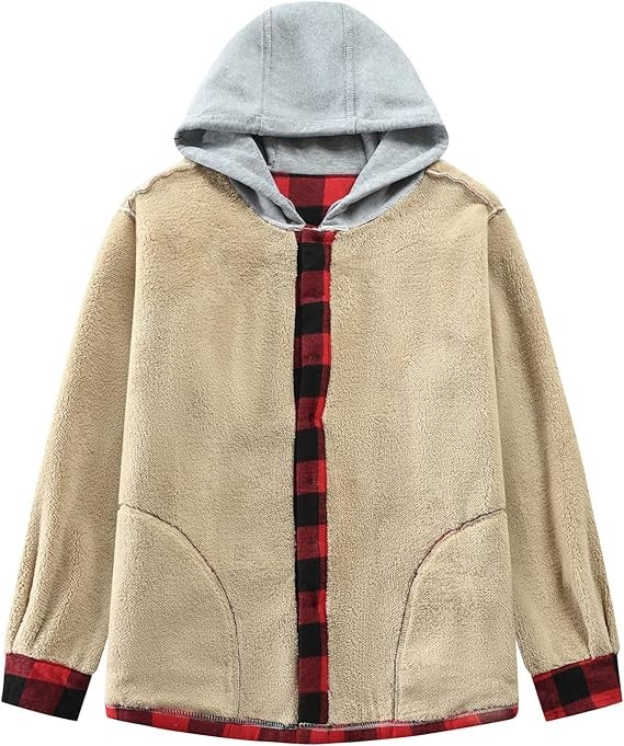 Comfortable Fit: This long sleeve flannel shirt crafted with a 100% Cotton flannel shell and soft beige sherpa lining will keep you warm all season long. Your new wardrobe favorite. Features: Button, long sleeves(The sleeves lined), 2 side pockets, drawstring hood, plaid element outer and fuzzy fleece inside, to provide extra warmth and comfort. Size: Our flannel shirts are regular fit style, a variety of sizes and colors for you to choose, please refer to the size chart to choose the size that suits you. Occasion: This is a versatile hooded jacket that will look stylish with your Tshirt and jeans. Perfect For Daily Wear, such as hiking, trekking, camping, hunting, biking and other outdoor activities. Any occasion is perfect in Spring, Fall and Winter.
