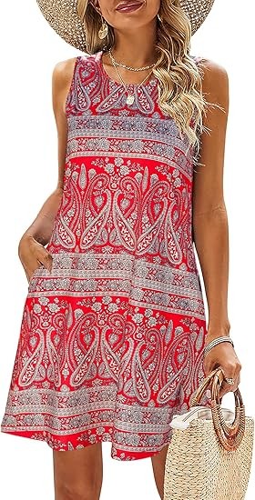 Feature: Summer Dresses for women comes with colorful floral print, round neck casual style,sleeveless,two side pockets which were deep enough to put into cards or lipsticks,Boho style, Swing Hem, sundresses;The bright Colorful print looks shine in summer Occations: T shirt dress is comfy enough to wear around the house as house dresses,work dress for women office,shopping,walking,and wear it to a casual evening out for graduation party,travel,beach wear Season: sun dress for women is above the knees and long enough that you wouldn't need to wear leggings with it if you didn't want.Boho dresses suit for summer or you can also collocate a coat in spring, autumn or winter Match: Cute tank dress great with jewelry,sandals,heels,flip flops or even sneakers.Casual loose swing dress also can look sexy if you pair it with a belt for a night out and paired with a pair of boots will make you looks great.