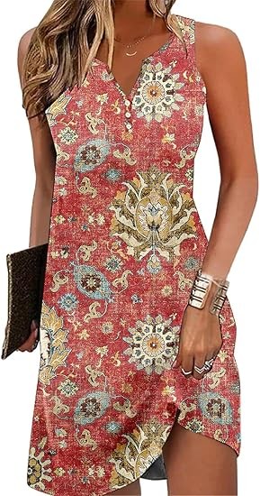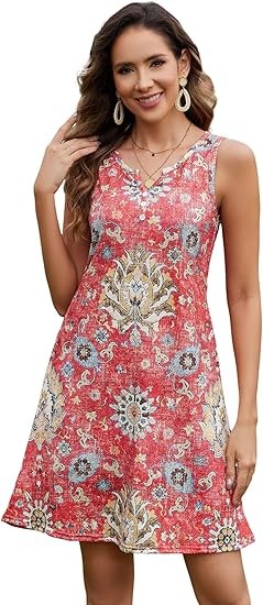 Material: 95%Polyester,5%Spandex.Skin-Friendly,Breathable,Nice and more of a soft stretchy feel.Not see through,Not shrinkage,Lightweight,Ideal for summer weather. Features:This dress features a V-neck,Sleeveless,Floral Print design.The A-line silhouette flatters all body shapes.Ideal for vacation or everyday wear,Is a must-have for the fashion-forward woman. Occasion: Whether you're heading to the beach,A dinner out,Or a casual day of shopping,This dress is versatile enough to suit any occasion.Pair it with sandals for a laid-back look or dress it up with heels and accessories for a more polished ensemble. Attention:Machine or hand wash with cold water/Hang or line dry/No bleach. Please forgive the slight color difference caused by different computer and mobile phone monitor settings.