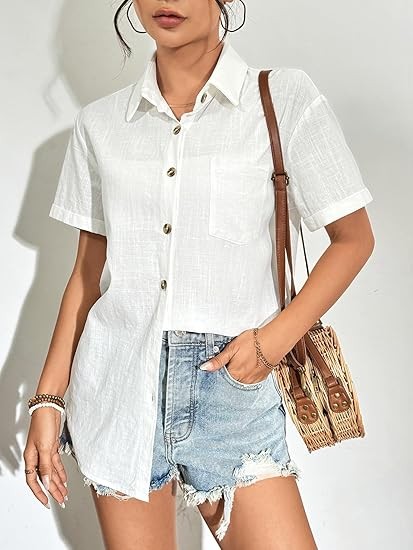 MATERIAL: All cotton fabric women's summer tops, special linen textures, skin-friendly, breathable, soft light, and airy picks for summer, early fall, and spring, providing extreme comfort and charm. FEATURES: Linen tops for women, button closure, short sleeve, loose fit, v-neck, basic turn-down collar shirt, flattering stylish curved hem, boyfriend style, classic, elegant and trendy loose fit shirts. MATCHES: This summer button-down shirt for women is great for casual and work, can be worn alone as a shirt or dressed up with a variety of tank tops, jeans, denim shorts, skirts, sneakers or heels to complete a dressy casual look. OCCASIONS: This Casual shirt is suitable for daily, casual, dating, club, party, street, outdoor, office, informal work, pair it with jackets or fall coats, great for spring & summer & fall wear. Provide you with a casual look that's easy to love all season long.