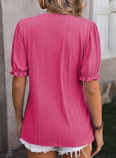 Womens Summer Short Puff Sleeves Blouses Shirts V Neck Cute Solid Knit Textured Casual Regular Fit Tops