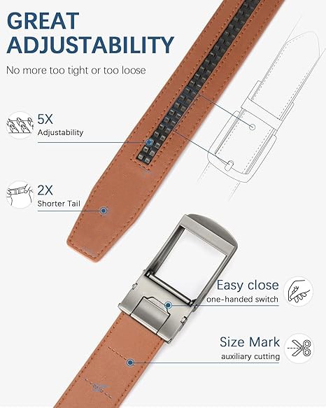 Easy to Use: Loosen and tighten as needed in a second. Just slide the belt into the buckle and pull the leather belt through, the buckle simply auto locks the belt, releasing the buckle by simply shifting the small lever. Cuttable Design: Do You always had issues with belt buckles digging into and always being too big or too small? this leather belt for men come with a long leather belt strap that has lines and sizes so you can cut for optimum length.