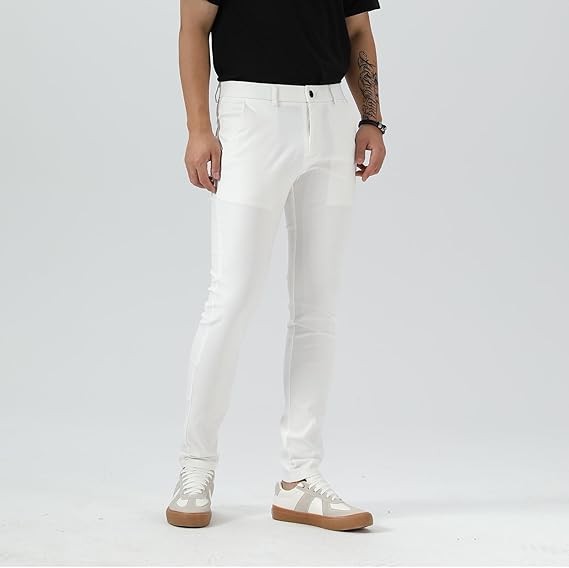 Skinny fit through hip and thigh, these plaid pants for men sit at the natural waist; the innovative mens plaid dress pants bring younger looking. ALL-DAY COMFORT. Made from a nylon &viscose blend with added spandex that moves with you for all day comfort. Throw together an effortless look with these skinny pants for men. With these mens skinny dress pants, we make looking great incredibly easy. Keep it casual and stylish as you step out wearing the mens skinny pants, these men's skinny dress pants can keep you comfort all day. Whether you step into the office or step out on the weekend, our men's skinny chinos fit your needs perfectly. Thank to the TR fabric with flex, even they are Skinny fit, you can still move and walk freely wearing these mens fashion pants. And these fashion pants for men bring a sleek silhouette. Pinstripe pants for who want a more modern feel with the refined extra slim fit, the style it's good for dress up and dress down.