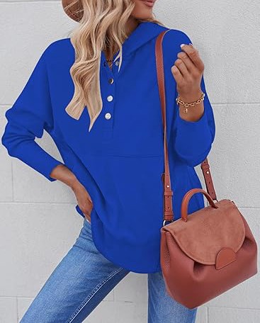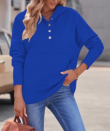 Features: This trendy hoodie sweatshirt for women features long sleeves, a button-down V-neck, a large kangaroo pocket, and an oversized design for a relaxed and baggy appearance. The cuffs, hem, and pocket edges are ribbed for ample elasticity, offering a superior wearing experience suitable for any body type. It's a great addition to your wardrobe.