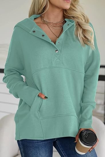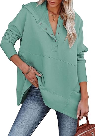 Material: 95% Polyester + 5% Elastane; This trendy cute hoodie top is made of soft and skin-friendly fabric, comfy and comfortable, providing you with a loose and cozy wearing experience. Features: This trendy hoodie sweatshirt for women features long sleeves, a button-down V-neck, a large kangaroo pocket, and an oversized design for a relaxed and baggy appearance. The cuffs, hem, and pocket edges are ribbed for ample elasticity, offering a superior wearing experience suitable for any body type. It's a great addition to your wardrobe. Match:Loose-fitting hoodie tops effortlessly complement various casual bottoms like leggings, pants, jeans, joggers, and shorts, when paired with sneakers or casual shoes, to achieve a stylish and chic appearance during the spring, fall, and winter seasons. Wearing it creates the most beautiful and stylish look. Occasion:This pullover sweatshirt is Perfect for daily, home, school, shopping, going out, club, night out, holiday, weekend, vacation, office, work, date, streetwear, etc.It's also a good gift to your friend or family in spring,fall and winter.