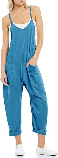 Womens Casual Sleeveless Jumpsuits Spaghetti Strap Loose Romper Long Pants with Pockets