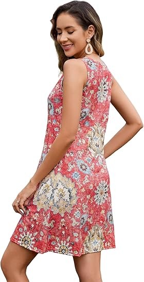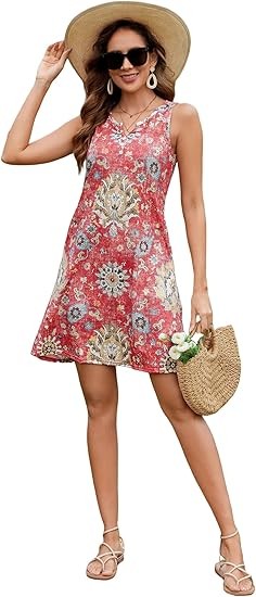 Material: 95%Polyester,5%Spandex.Skin-Friendly,Breathable,Nice and more of a soft stretchy feel.Not see through,Not shrinkage,Lightweight,Ideal for summer weather. Features:This dress features a V-neck,Sleeveless,Floral Print design.The A-line silhouette flatters all body shapes.Ideal for vacation or everyday wear,Is a must-have for the fashion-forward woman. Occasion: Whether you're heading to the beach,A dinner out,Or a casual day of shopping,This dress is versatile enough to suit any occasion.Pair it with sandals for a laid-back look or dress it up with heels and accessories for a more polished ensemble. Attention:Machine or hand wash with cold water/Hang or line dry/No bleach. Please forgive the slight color difference caused by different computer and mobile phone monitor settings.