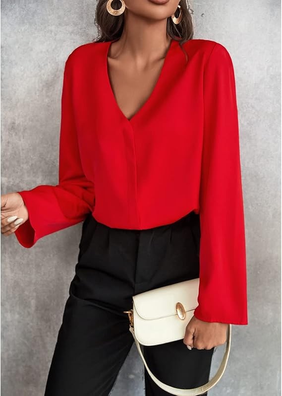 Women's Long Sleeve Shirts V Neck Business Casual Plain Work Blouses Tops