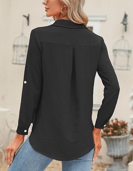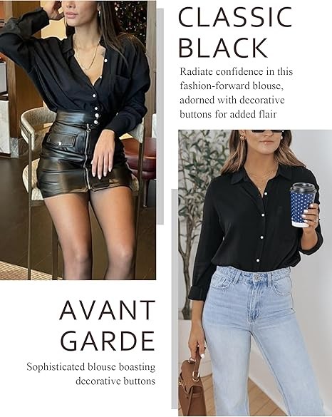 Effortless Style, Multiple Options: Elevate your look with our black button up shirt women. These business casual outfits for women seamlessly blend comfort with chic style. The 3/4 sleeves offer versatility—wear them as is, roll them up, or opt for a classic long sleeve look. Perfect for various weather, occasions, and outfit needs, this shirt provides a simple yet stylish solution for your wardrobe.