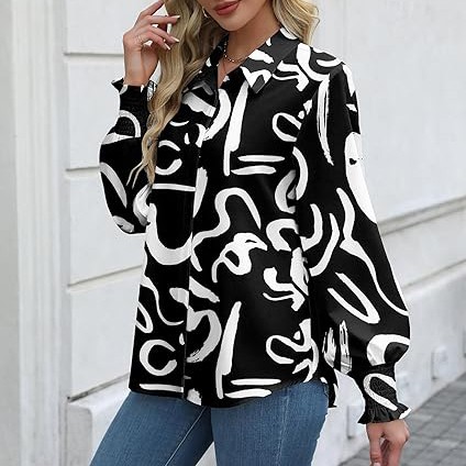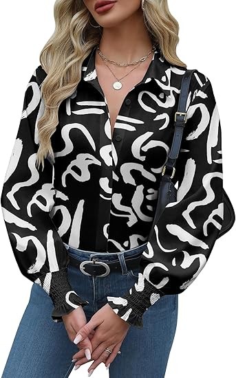 Womens Button Down Shirts Smocked Cuffed Blouse Printed Lantern Shirt Long Sleeve Top Collar Business Fashion
