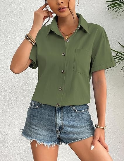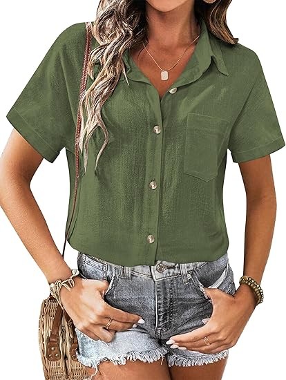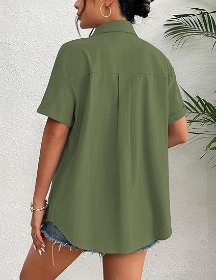 MATERIAL: All cotton fabric women's summer tops, special linen textures, skin-friendly, breathable, soft light, and airy picks for summer, early fall, and spring, providing extreme comfort and charm. FEATURES: Linen tops for women, button closure, short sleeve, loose fit, v-neck, basic turn-down collar shirt, flattering stylish curved hem, boyfriend style, classic, elegant and trendy loose fit shirts. MATCHES: This summer button-down shirt for women is great for casual and work, can be worn alone as a shirt or dressed up with a variety of tank tops, jeans, denim shorts, skirts, sneakers or heels to complete a dressy casual look. OCCASIONS: This Casual shirt is suitable for daily, casual, dating, club, party, street, outdoor, office, informal work, pair it with jackets or fall coats, great for spring & summer & fall wear. Provide you with a casual look that's easy to love all season long.