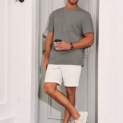 Mens Short Sleeve T-Shirts Casual Knit Texture Crewneck Pocket Tee Tops Loose Fit Summer Shirt