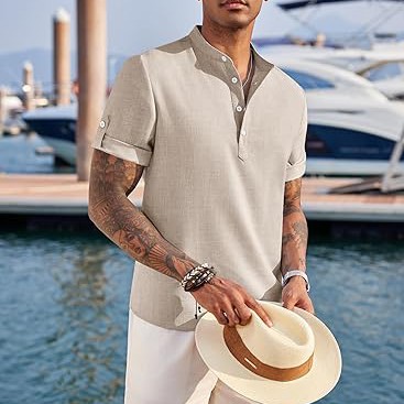 PREMIUM FABRIC】: The summer beach shirt is made of high-quality fabric, which is lightweight, breathable, soft to the touch, moisture-wicking and non-fading. 【CASUAL & FASHION】: Mens casual chambray shirt comes with band collar, button-down closure, rounded hem. The henley shirt can be worn with the sleeves rolled up or down, keep you cool and relaxed all the time especially in hot summer. 【CLOTHING MATCH】: Men's short sleeve summer shirt could be easy to match with slacks, chinos, jeans or dress pants to create a simple yet stylish look. Wear with shorts, sunglasses and a hat for the perfect beach vacation look.