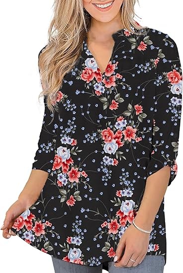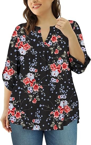 【SIZE】Womens plus size tops, plus size blouses for women, 6 US sizes(M,L,1X,2X,3X,4X) 【FEATURES】Floral Print, 3/4 sleeve, fashion V neck design,plus size tops for women, swing hem drapes nicely and hides your belly & hips well, adds femininity 【PAIRS WITH】Plus size 3/4 sleeve tops for women, plus size blouse, match this plus tunics with jeans, leggings in Spring, Summer and Fall 【OCCASIONS】 Dressy casual business fashion comfy loose fitting womens plus size blouses, Suitable for Office/ Dating/ Formal Occasions/ Daily Casual Wear/ Workwear, etc