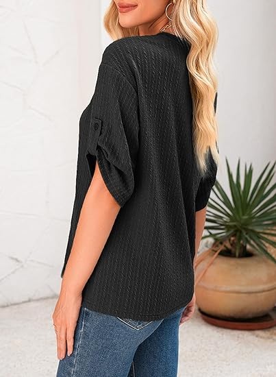 Women's Tops Dressy Casual V Neck Short Sleeve Rolled Hem Loose Blouses T Shirts